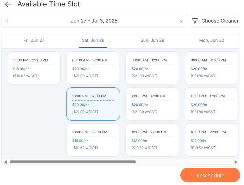 4. You will then be led to the rescheduling interface. Here, you can choose the slot on when you would like to reschedule. You can scroll down the slots to see more available slots and click **See More** at the bottom of the slot interface. The rate displayed between each session is the hourly cost for that session.