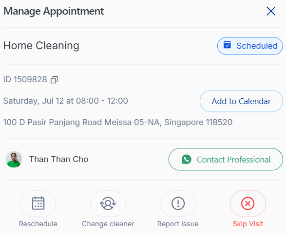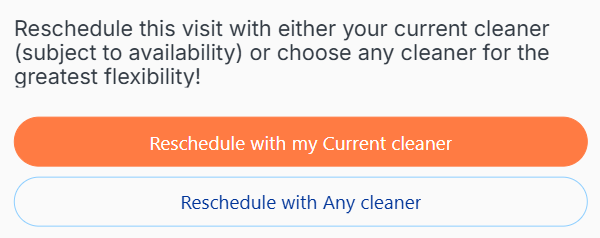 3. Another pop-up will appear asking if you would like to reschedule with the same cleaner or if you're open to reschedule with any cleaner. If you are open to a different cleaner, you may find that there are more times available to choose from. After choosing your preference, click on the corresponding button.<br>